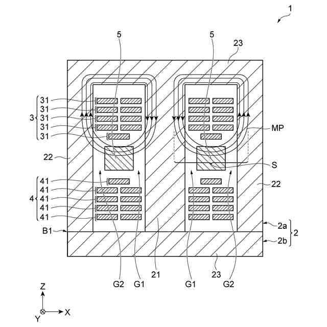 複数の一次層では、ギャップに近い層ほど巻数が少なくてもよく、複数の二次層では、ギャップに近い層ほど巻数が少なくてもよい。この場合、一次巻線の、ギャップに近い一次層ほど巻数が少ないので、ギャップに近い一次層においてギャップから離れた位置に一次巻線を構成する導電性部材を配置するだけで、第1方向から見てギャップと重なる部分を小さくできる。同様に、二次巻線の、ギャップに近い二次層ほど巻数が少ないので、ギャップに近い二次層においてギャップから離れた位置に二次巻線を構成する導電性部材を配置するだけで、第1方向から見てギャップと重なる部分を小さくできる。