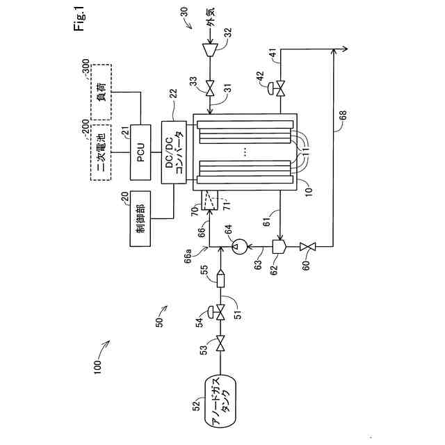 図1は、本実施形態の燃料電池システム100の構成を示す概略図である。燃料電池システム100は、主に燃料電池スタック10、制御部20、パワーコントロールユニット(以下、「PCU」という)21、DC/DCコンバータ22、カソードガス供給排出系30、およびアノードガス供給排出系50を備える。燃料電池システム100は、外部の二次電池200および負荷300に接続されている。本実施形態の燃料電池システム100は、例えば燃料電池車両に搭載され、制御部20は、燃料電池車両のコンピュータとの間で制御信号を授受する。