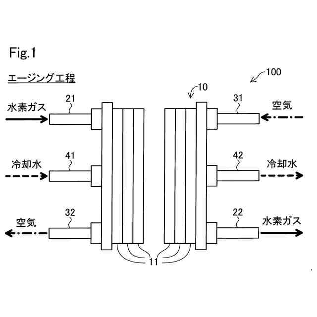 【解決手段】燃料電池スタックは、酸化剤ガス入口マニホールドと、冷却水入口マニホールドと、冷却水出口マニホールドと、を備える燃料電池セルを有し、エージング方法は、酸化剤ガス入口マニホールドから酸化剤ガスと水とを混合させて流入させるエージング工程を備え、エージング工程において、酸化剤ガス入口マニホールドは、冷却水入口マニホールドよりも冷却水出口マニホールドに近い位置となるように設定される。