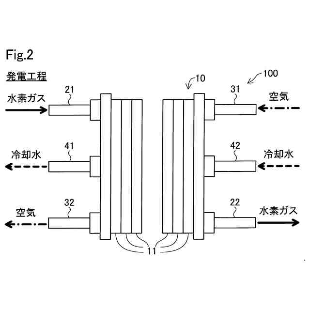 各燃料電池セル11は、単体で発電可能な発電要素であり、電解質層の両側にアノードとカソードの両電極を接合させた膜電極接合体(Membrane Electrode Assembly/MEA)と、膜電極接合体を挟む2枚のセパレータと、を有する。電解質層は、内部に水分を包含した湿潤状態のときに良好なプロトン伝導性を示す固体高分子薄膜によって構成される。電極には、燃料ガスおよび酸化剤ガスの電気化学反応を促進する触媒が配置されている。触媒は、例えば、白金(Pt)によって構成される膜電極接合体のアノード側およびカソード側のそれぞれの表面上には、ガス透過性および電子伝導性を有するガス拡散層が配置されてもよい。