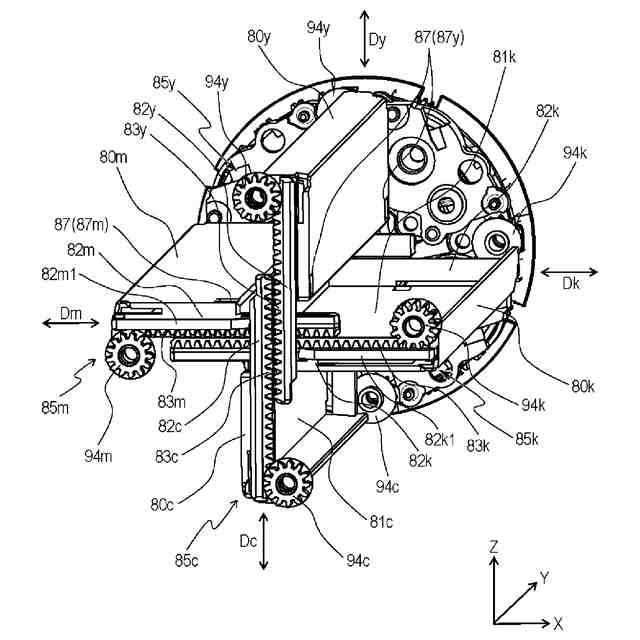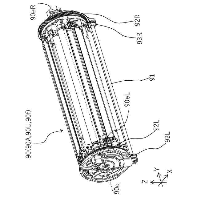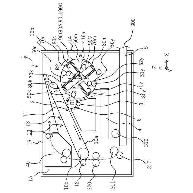 図1~図12(a)、図12(b)及び図17を用いて、実施形態の画像形成装置1について説明する。以下の説明及び各図面において、画像形成装置1が水平面に設置された場合の鉛直方向をZ方向とする。Z方向と交差する方向であって、後述するロータリ本体90の軸線方向に延びる回転軸線90Cの方向(ロータリの回転軸線方向)をY方向とする。Z方向及びY方向の双方と交差する方向をX方向とする。X方向及びY方向は、好ましくは水平方向である。また、X方向、Y方向、Z方向は、好ましくは互いに直交する。また、必要に応じ、各図面に図示した矢印X、Y、Zの方向をそれぞれ+X側、+Y側、+Z側と表し、その反対側をそれぞれ-X側、-Y側、-Z側と表す。