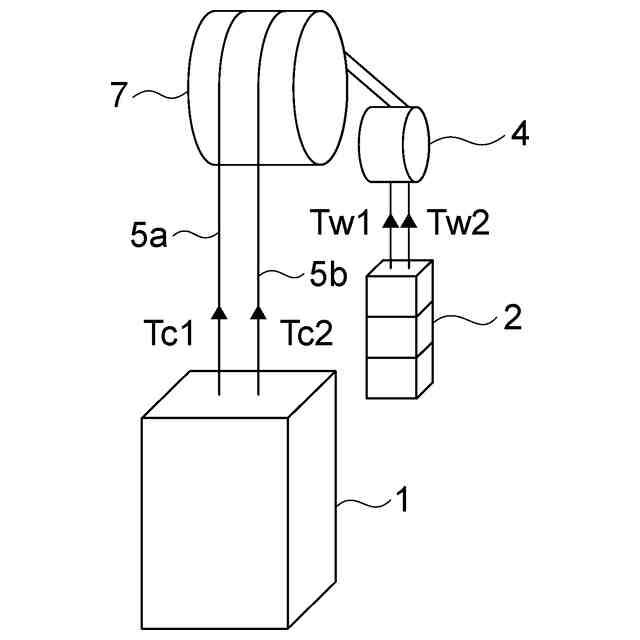 エレベーター装置10は、かご1と、釣合おもり2と、巻上機3と、そらせ車4と、複数本のロープ5と、エレベーター制御装置11とを備えている。図1では、1本のロープ5のみが示されている。
