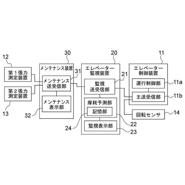 図1は、実施の形態1によるエレベーターシステムを示す概略の構成図である。図において、エレベーターシステムは、エレベーター装置10と、エレベーター監視装置20と、メンテナンス装置30とを備えている。