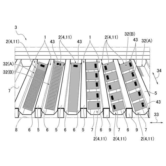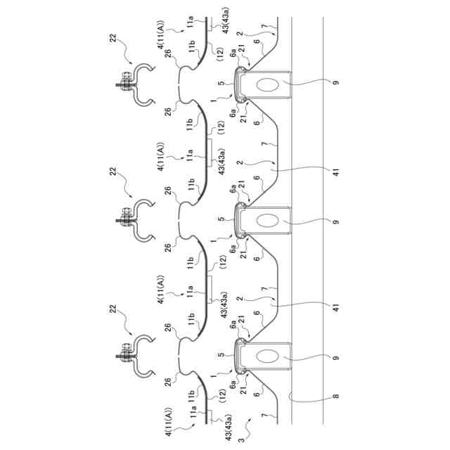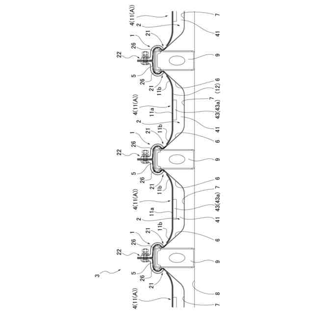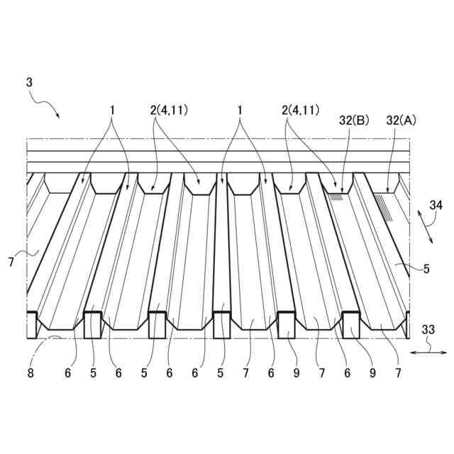 シート状または薄板状の太陽電池11は、折版屋根3の谷部分2に合う形状とされて、折版屋根3の谷部分2に設置される。