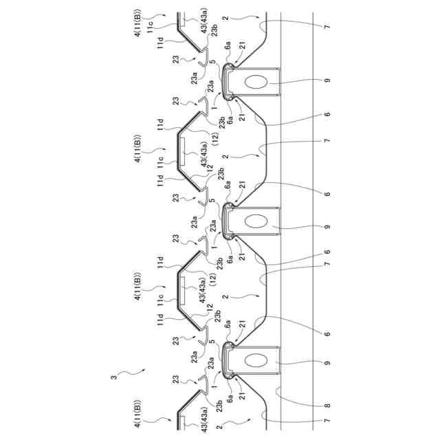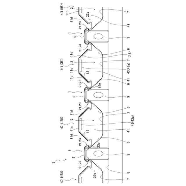 シート状または薄板状の太陽電池11は、凹形状として、谷部分2に下へ凹むように設置されても良い。