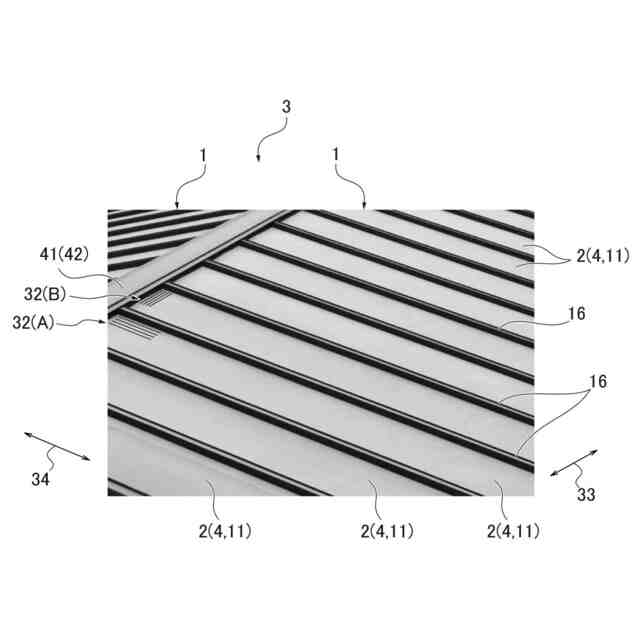 太陽電池4は、シート状の太陽電池11とされて、金属屋根3の金属仕上材2の上に面接触状態で配置される。