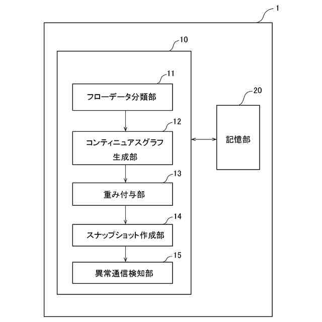特許文献1では、IPFIX(IP Flow Information Export)等のフローデータを用いて、通信順序や機能遷移などの通信の振る舞いに着目したグラフの構築方法と異常通信検知方法を提案している。IPFIXレコードの集合に対して予めアプリケーション識別を適用してラベルを付与し、IPFIXの時系列順にラベルの遷移をグラフ化することによって、通信の順序や機能遷移を表現している。