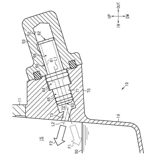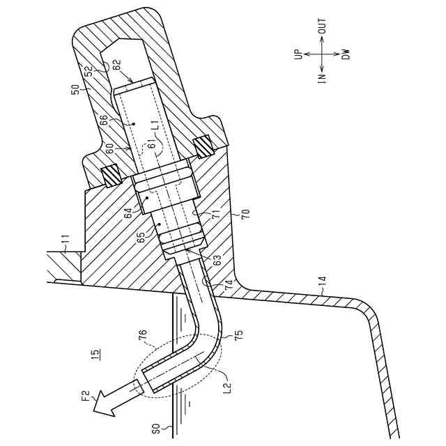 エンジン10は、シリンダブロック11を備えている。シリンダブロック11の内部には、複数のシリンダ12が形成されている。図1には、複数のシリンダ12のうちの一つのみが表示されている。各シリンダ12にはそれぞれ、ピストン13が往復動自在に収容されている。シリンダ12におけるピストン13よりも上側の部分には、水素を燃焼する燃焼室17が形成されている。シリンダブロック11の下部には、オイルを貯留するオイルパン14が取り付けられている。シリンダブロック11の内部におけるシリンダ12よりも下側の部分には、クランクケース15が形成されている。シリンダブロック11の上部には、シリンダヘッド16が取り付けられている。シリンダヘッド16の内部には、シリンダ12毎にそれぞれ個別の吸気ポート18及び排気ポート19が形成されている。シリンダヘッド16の上側には、ヘッドカバー16Aが取り付けられている。ヘッドカバー16Aで覆われたシリンダヘッド16の上部内側には、動弁機構を収容する動弁室20が形成されている。