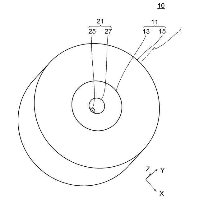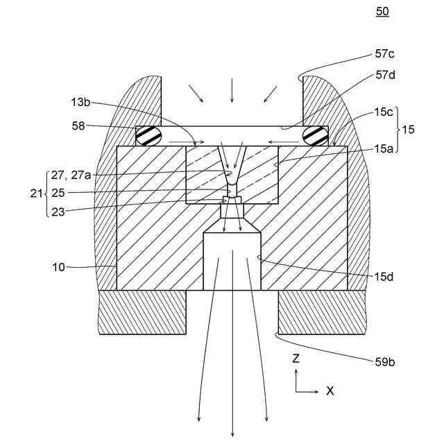 図1~5に示すように、本実施形態のノズル(キャビテーション表面処理用ノズル)10は、ノズルボディ11を有する。ノズルボディ11は、ノズルチップ13と、支持台15と、を有する。ノズル10は、噴射軸線1を有する。便宜上、第1方向をX、噴射軸線1の延びる方向をZ、XYに垂直な方向をYとする。