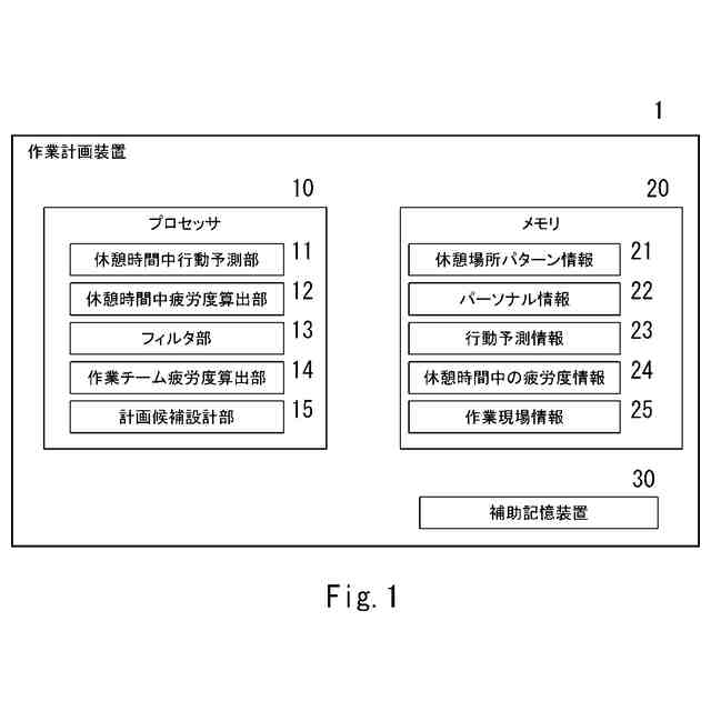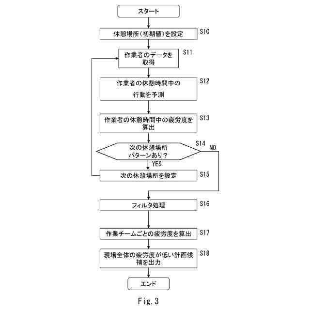 また、上記作業計画装置において、前記休憩場所パターンは、作業現場から休憩場所への移動距離、休憩場所の座席の有無、休憩場所の喫煙スペースの有無、休憩場所の健康器具の有無、休憩場所の糖分補給の有無、休憩場所の塩分補給の有無のうち少なくとも1つを含んでよい。