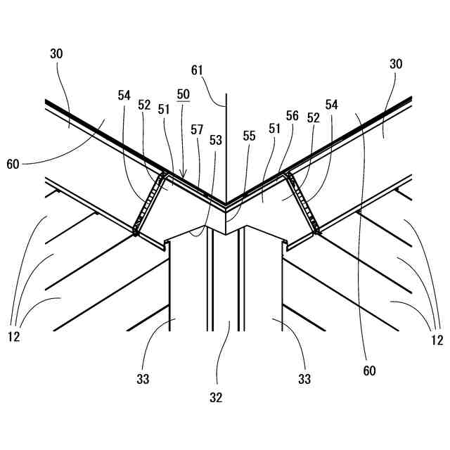 なお、本発明における「実質的に重なるように配置されている」とは、出隅形状または入隅形状の略V字形の形成面と、コーナー端部化粧材の略V字の端部とが、実質的に重なる態様を意味している。このため、両者は必ずしも完全に重なっていなくてもよい。例えば、コーナー端部化粧材の先端に、排水スリット、クリアランス、目地などが設けられていることで、出隅形状または入隅形状の略V字形の形成面と、コーナー端部化粧材の略V字の端部とが、わずかにずれているような態様も含む。具体的には、コーナー端部化粧材の略V字の端部の先端に排水スリットを形成するために、あえてコーナー端部化粧材を短く形成し、出隅形状または入隅形状の先端まで到達しないようにしてもよい。