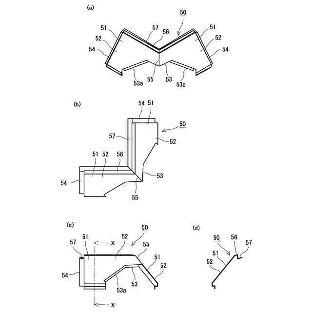 出隅用の交差カバーを示す図であって、(a)斜視図、(b)平面図、(c)側面図、(d)X-X線端面図である。