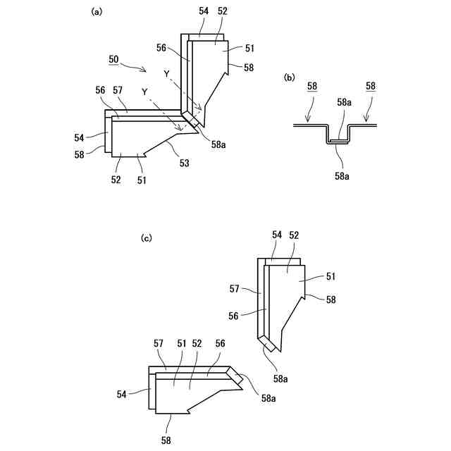 変形例に係る出隅用の交差カバーを示す図であって、(a)斜視図、(b)Y-Y線端面図、(c)分解図である。