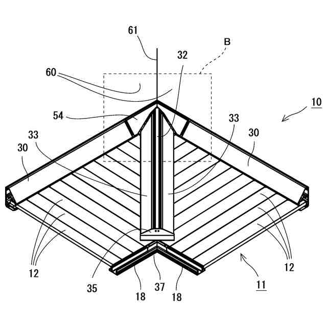 本実施形態に係る建物用庇10は、2つの壁面60が交わるコーナー部61に配置可能なものであり、図1に示すような出隅用の庇と、図7に示すような入隅用の庇とがある。以下、まずは出隅用の庇を例に説明する。