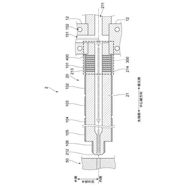 図1の加熱シリンダの温度勾配を生じさせる部分に熱伝導の異方性を有する部材を配置する手法の一例を示す図である。