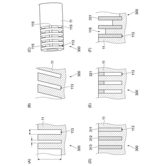 (A)乃至(F)は、図1の加熱シリンダの温度勾配を生じさせる部分に配置された熱伝導の異方性を有する部材の変形例を示す図である。
