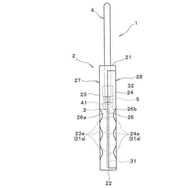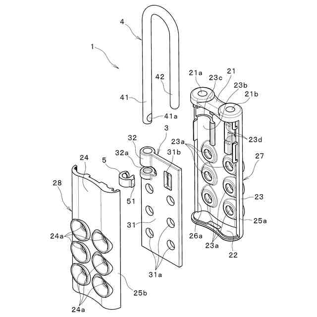 ケース2は、ケース本体27とケース蓋体28とで構成され、いずれも合成樹脂で一体成形され、互いに前後方向にスナップ係合して扁平な箱状体を形成する。