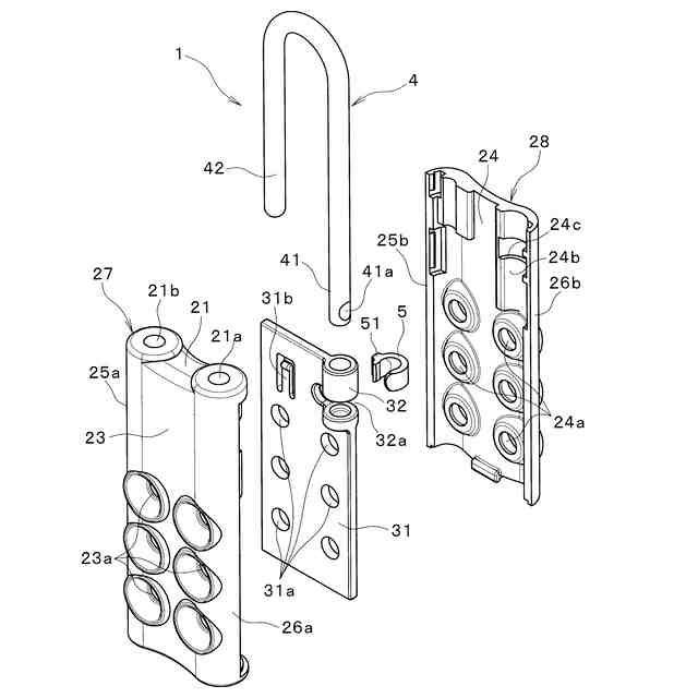 ケース2は、スイベル孔21aと挿通孔21bを有する上板部21と、これに対向する下板部22と、前板部23と、これに対向する後板部24と、左右側板部25,26とを有し、前板部23と後板部24を前後方向に貫通する複数の貫通孔23a,24aが形成される。