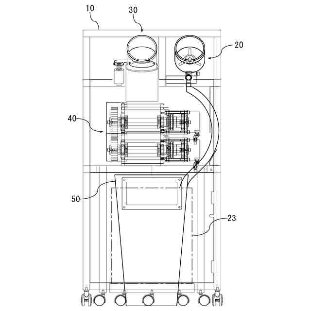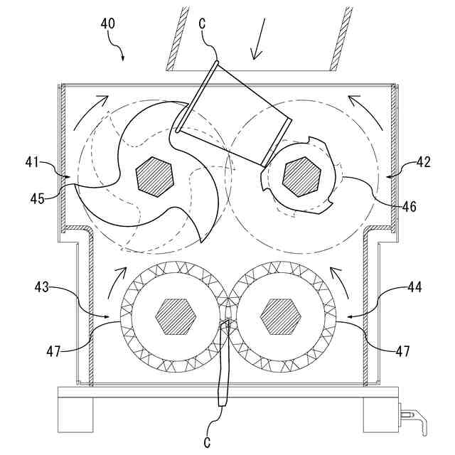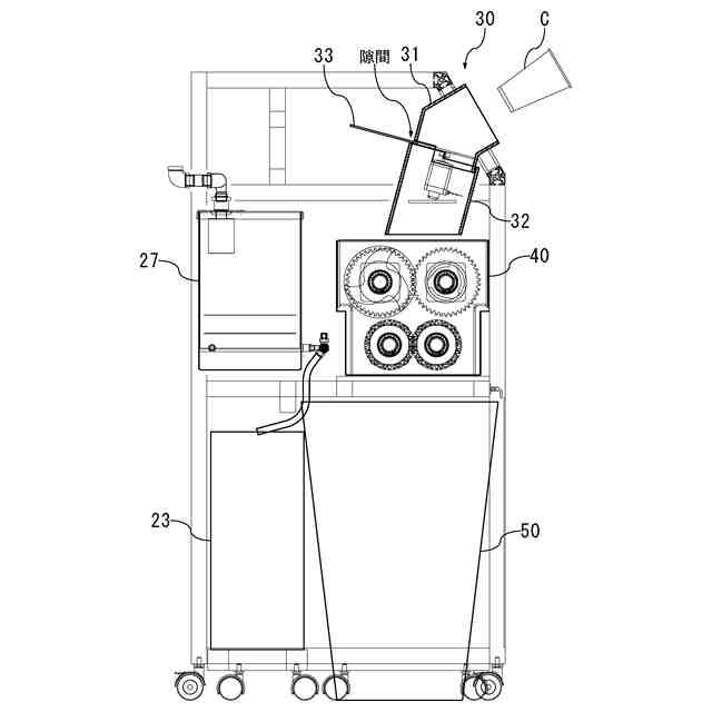 特許文献2には、ドリンクショップ、ファストフードショップ等の店舗内に設置する、使用したコップ、カップ又は皿などの使い捨て容器を回収する使用済み使い捨て容器の処理装置であって、飲み残しと氷を回収する飲み残し回収口と、該飲み残し回収口に隣接して使用した容器を投入する容器投入口が上部に設けられ、かつその高さが、該飲み残し回収口と容器投入口に、容器を捨てようとする人の手が届く高さである90~110cmに形成された処理装置本体と、前記飲み残し回収口の下部に設けられた、飲み残しを一時貯留する飲み残し用タンクと、前記容器投入口の下部に設けられた、容器を所定の大きさの細片に破砕する刻み目が形成された回転刃が軸方向に並べられた第1回転刃軸と、同様な形状の刻み目を有する第2回転刃軸とから成り、第1回転刃軸と第2回転刃軸の各回転刃が噛み合うように並べられ、かつ向かい合う方向にそれぞれ回転させる構成の破砕装置と、前記破砕装置において破砕された容器の細片を水洗浄し、その細片に付着した水分を圧縮空気で除去する、筒体内で洗浄水と洗剤で洗浄回転するスクリューコンベアがその軸方向に設けられ、該筒体の下部に洗浄後の洗浄水を排水する排水口と細片を排出する細片排出口と、該筒体の上部に細片を投入する細片投入口が取り付けられ、該筒体における排水口と細片投入口の間に、コンプレッサーの圧縮空気を噴射する噴射口を有する、洗浄・脱水・圧縮装置と、前記洗浄・脱水・圧縮装置において洗浄と脱水が済んだ容器の細片を、収納する細片回収ボックスと、を備え、前記飲み残しタンク、破砕装置、洗浄・脱水・圧縮装置、コンプレッサー及び細片回収ボックスの全てが前記処理装置本体内に収納され、かつ該処理装置本体内において容器を破砕、洗浄と圧縮をして、その嵩を減量させる、ことを特徴とする使用済み使い捨て容器の処理装置が記載されている。