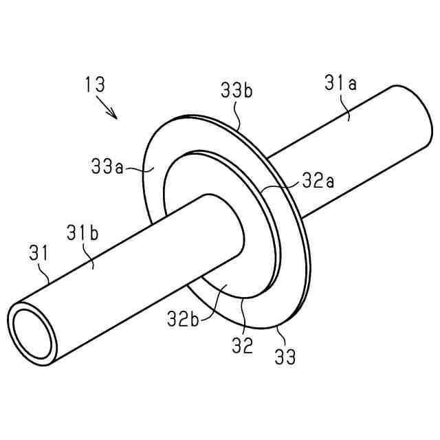 前記パイプ本体は、前記パイプ本体の軸方向において、前記フランジよりも前記内側部材側に位置する第1部位と、前記フランジよりも前記外側部材側に位置する第2部位とを有し、