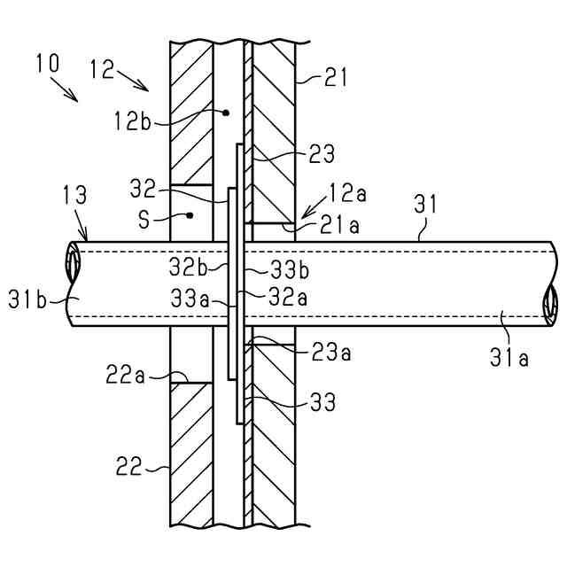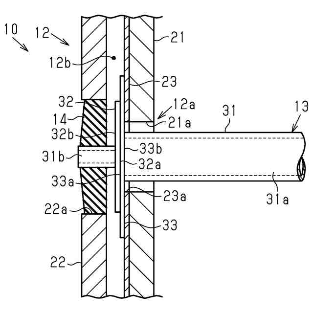【解決手段】外壁12は、内側部材としての下地材21と、内側部材よりも屋外側に設けられた外側部材としての外装材22と、下地材21における外装材22側の面に設けられた第1防水層としての第1防水シート23とを有している。外壁12を貫通する貫通孔12aに挿通されるパイプ13は、パイプ本体31と、フランジ32と、フランジ32の第1端面32aに設けられた第2防水層としての第2防水シート33とを有している。貫通孔12aは、下地材21を貫通する第1孔径の第1孔21aと、外装材22を貫通する第2孔径の第2孔22aとを有している。フランジ32は、第1孔径よりも大きく、かつ第2孔径よりも小さい。第2防水シート33は、第1防水シート23に貼り付けられている。