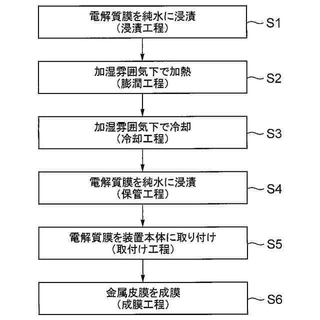 好ましい態様としては、前記膨潤工程の前に、前記電解質膜を純水に浸漬させる浸漬工程をさらに含む。別の好ましい態様としては、前記膨潤工程後、前記保管工程前に、前記加湿された雰囲気下で、膨潤させた前記電解質膜を冷却する冷却工程をさらに含む。