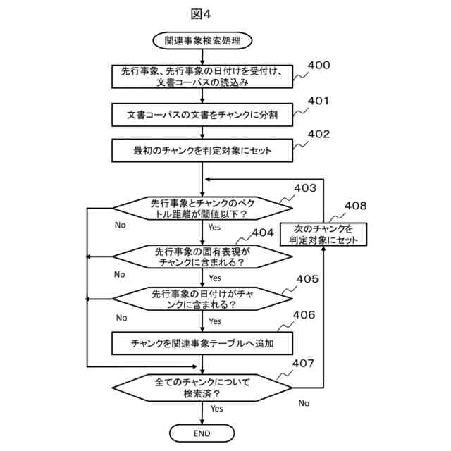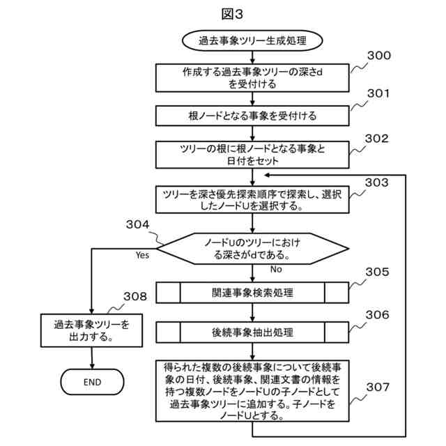 過去事象ツリー生成部が文書から過去事象を読み込み、ベクトル距離が予め定められた閾値以下の文書で過去事象ツリーを生成し、