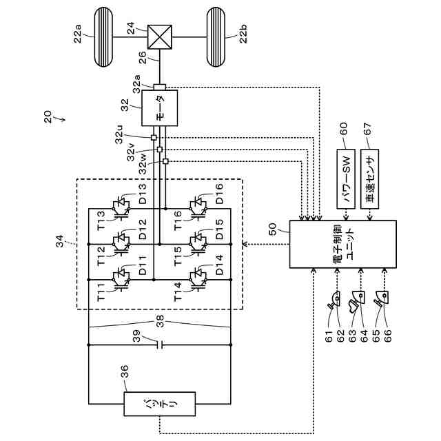 モータ32は、三相交流電動機として構成されており、回転子コアに永久磁石が埋め込まれた回転子と、固定子コアに三相コイルが巻回された固定子とを備える。モータ32の回転子は、駆動輪22a,22bにデファレンシャルギヤ24を介して連結された駆動軸26に接続されている。インバータ34は、電力ライン38に接続されている。インバータ34は、6つのスイッチング素子としてのトランジスタT11~T16と、6つのトランジスタT11~T16にそれぞれ並列に接続された6つのダイオードD11~D16とを備える。トランジスタT11~T16は、それぞれ、電力ライン38の正極ラインおよび負極ラインに対してソース側およびシンク側とになるように2個ずつペアで配置されている。トランジスタT11~T16の対となるトランジスタの接続点の各々は、モータ32の三相(U相、V相、W相)コイルの各々に接続されている。したがって、電子制御ユニット50によって、対となるトランジスタT11~T16のオン時間の割合が調節されることにより、モータ32の三相コイルに回転磁界が形成され、モータ32(回転子)が回転駆動される。バッテリ36は、例えば、リチウムイオン二次電池やニッケル水素二次電池として構成されており、インバータ34と共に電力ライン38に接続されている。電力ライン38の正極ラインと負極ラインとには、コンデンサ39が取り付けられている。