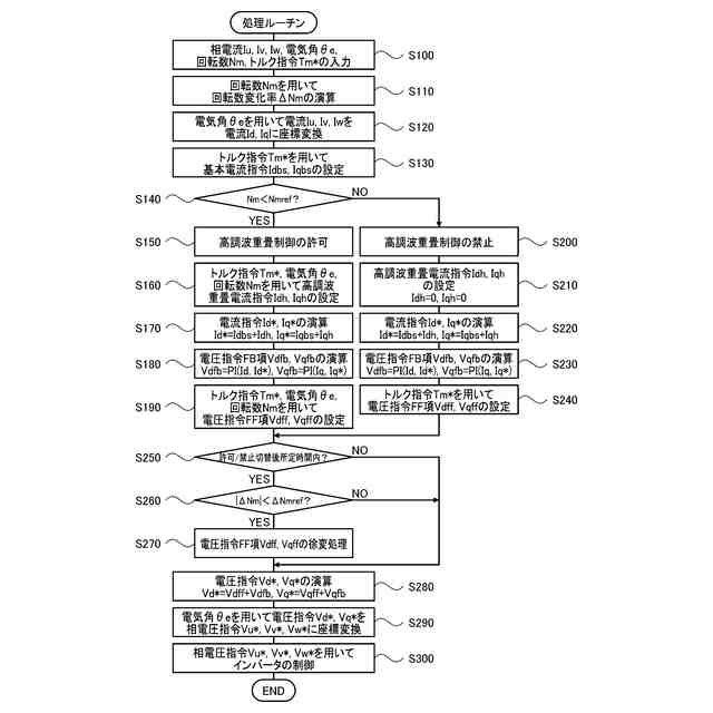 駆動輪に連結されたモータと、モータを駆動するインバータと、を備える電動車に搭載された制御装置において、モータの回転数と所定回転数との比較により高調波重畳制御の許否を判定し、モータのトルク指令に基づくd軸、q軸の基本電流指令と高調波重畳制御の許否に基づくd軸、q軸の高調波重畳電流指令との和をd軸、q軸の電流指令として演算し、d軸、q軸の電流指令とd軸、q軸の電流との差分が打ち消されるようにd軸、q軸の電圧指令フィードバック項を演算し、高調波重畳制御の許否に基づくd軸、q軸の電圧指令フィードフォワード項とd軸、q軸の電圧指令フィードバック項との和をd軸、q軸の電圧指令として演算し、d軸、q軸の電圧指令に基づいてインバータを制御するものがある。こうした制御装置において、高調波重畳制御の許否の切替時に、d軸、q軸の高調波重畳電流指令や電圧指令フィードフォワード項が急変してトルクショックを生じる、というのを抑制するために、d軸、q軸の高調波重畳電流指令や電圧指令フィードフォワード項に徐変処理を施すことが考えられる。しかし、回転数変化率の絶対値が大きいときに、制御追従性(トルクのトルク指令に対する追従性)が低下し得る。本開示の制御装置は、高調波重畳制御の許否の切替時にモータの回転数変化率が大きい場合、制御追従性が低下するのを抑制することを主目的とする。