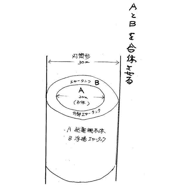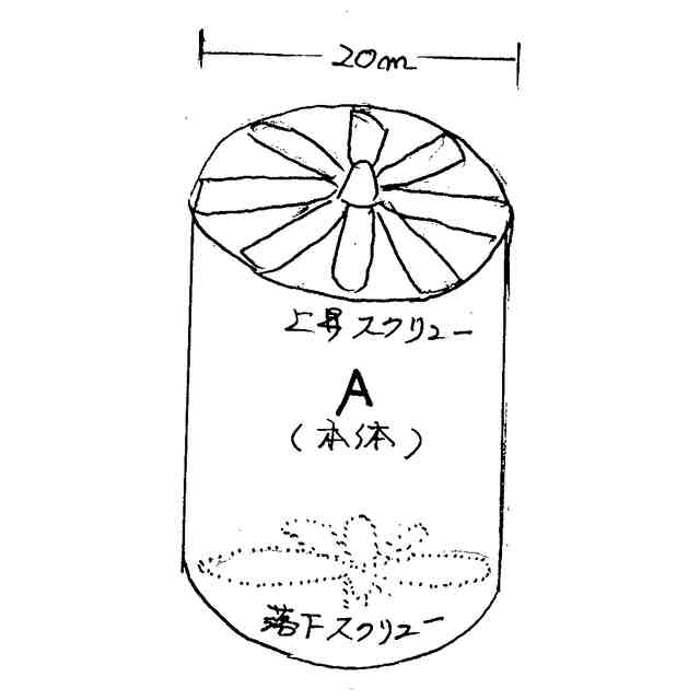 【解決手段】円筒形の発電機本体Aの上下に流体の上下道で回転する上昇・落下の各スクリューを備え、発電機本体を挿入したエアータンクと一体化することで海水との相対動きによるスクリューの回転運動で発電させる。