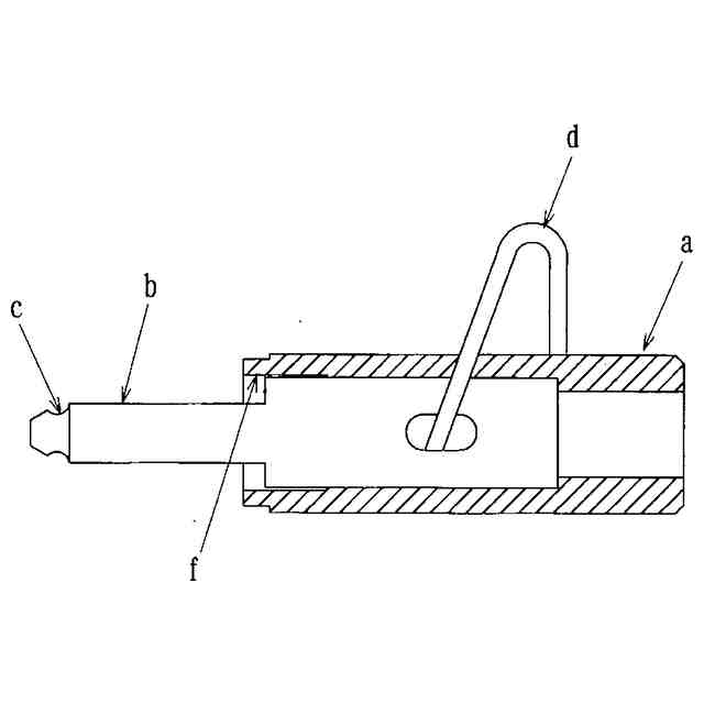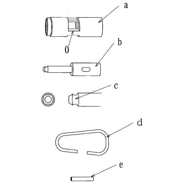 ジャック差込口ナット締め用の供回り防止レンチの分解図 a.ソケット部(12ポイント) b.回り止めピン(先端がシールド形状) c.回り止めピン先端シールド形状部分の拡大図 d.a.とb.をつなぐジョイントリング e.a.とb.をジョイントリングを接続後に切れ目を塞ぐビニールパイプ o.ソケット切り掛け部(ナット胴体の切込み止まり部分)