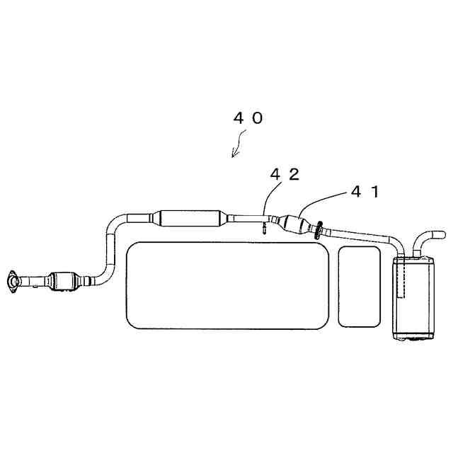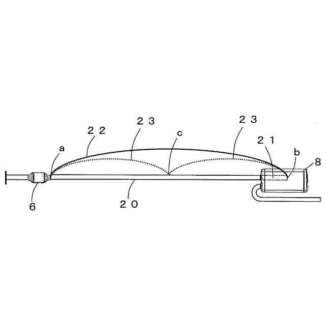 しかしながら、排気システム前半部が駆動用バッテリーパックを迂回することで干渉は避けられるが、駆動用バッテリーパックより後方(下流側)のレイアウトは従前と変わらないため、限られた車体前後寸法(後端)を前提とした駆動用バッテリーパックの後方拡大への対処にはなっていない。また、内筒に1つ又は2つの開口を設け外筒との長大な間隙を共鳴空間として使うサイドブランチ型のサブマフラを使用するため、長さが長大となり駆動用バッテリーパック側部に搭載し難いとともに、特定周波数のみを消音する特性なので周波数全域での消音効果は小さい。