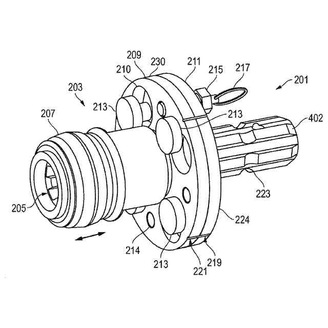 したがって、第2プレート211の各コネクタ213を第1プレート209の開口孔210aに嵌め込んだ後、小開口孔210bの方向に回転させてコネクタ213が開口孔210aから離脱しないように結合させた後、ロック用シャーピン(locking shear pin)215を、第1プレート209と第2プレート211に形成された貫通孔216に貫通させて締結することにより、第1プレート209と第2プレート211を互いに固定し、PTOの動力を作業機の動力軸に伝達する構造を有する。