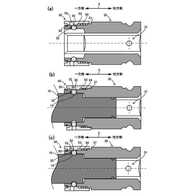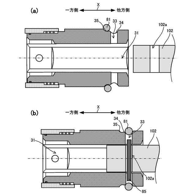 回転工具を用いて鉄板などに孔を空ける場合、まず回転工具にステップドリルを取付けて孔を空け、その後孔の径の調整のためにステップドリルからリーマに取り換える必要がある。また、孔の径の調整に伴い、リーマをさらに径の異なるものへ付け替えることもある。このように、回転工具を用いた作業では、作業の中で回転工具に接続されるステップドリル、リーマ、ソケットなど種々の先端工具(以下、「先端工具」という。)を付け替える必要がある。アダプタに対する先端工具の付け替えは、作業時間短縮の観点から簡便に行えることが望ましい。しかし、ねじによる螺着を前提とする場合には回転工具の作動によって増し締めされて先端工具の取り外しが困難になるという問題がある。