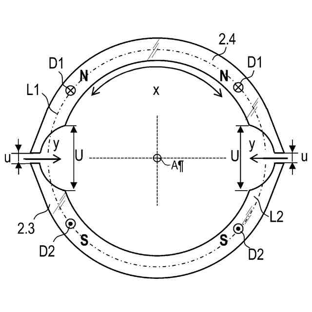 磁石(2.3,2.4)は、その磁石(2.3,2.4)が傍を通過する際に、その磁石によって、ドメインウォール導体(1.211)内のドメインウォールの変位を発生させることが可能であるように構成され配置されている当該位置測定装置。
