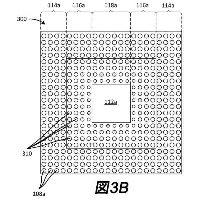 本開示の一実施形態による、可変サイズのダミー接点を含む遷移領域を有する、平坦化された接点パッドの概略上面図を示す。
