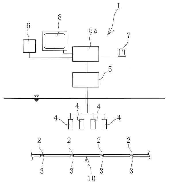 水中に延在する水中延在物に間隔をあけて設置される複数の発信機と、それぞれの前記発信機から発信される発信信号を受信する受信機と、前記受信機と通信可能に接続されたコンピュータと、を備えて、