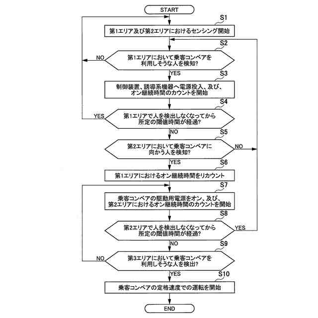 従来、乗客の利用が見込まれない時間帯においては乗客コンベアの運転を停止したり、微速運転させたりすること等によって、乗客コンベアの省エネルギー化が図られている。例えば、特許文献1には、乗客の検知エリアの所定高さを平面スキャンし、乗り口に存する個々の人を検知する検知ステップと、検知エリアで検知された人の内、乗客コンベアに向かう人が検知されると、乗客コンベアを定格運転モードへ移行又は継続する運転モード制御ステップと、を含む乗客コンベアの制御方法が開示されている。特許文献1に記載の技術によれば、検知エリアに進入した人のうち、乗車意思有利用者を識別し、自動発停止運転を行うことができる。