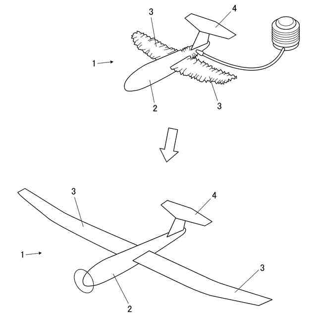 具体的に、無人航空機1は、胴体2、両主翼3及び尾翼4を備える固定翼機である。本実施形態の無人航空機1では、専ら両主翼3が空気により膨縮する。