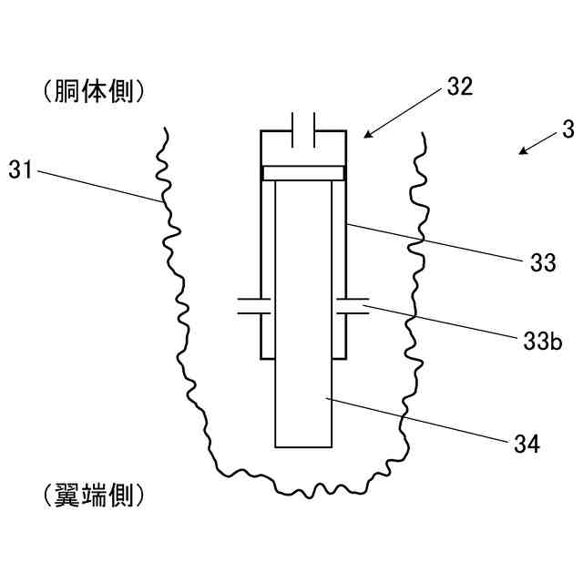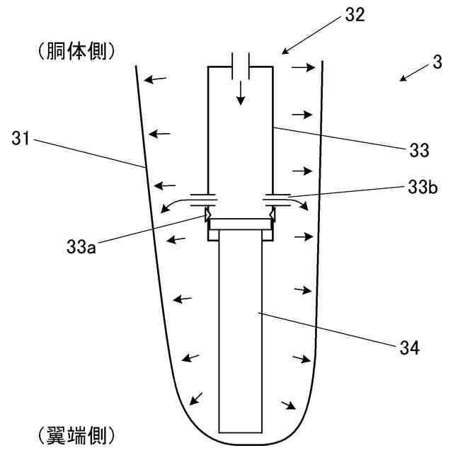 具体的には、図2に示すように、主翼3は、外皮部材である袋体31と、袋体31を支持する翼桁32及び複数のリブ35を備える。