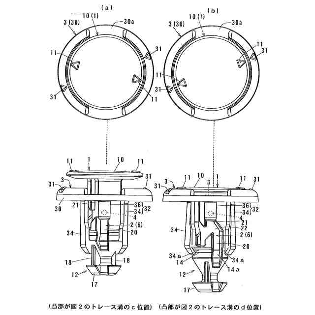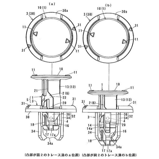 一方、特許文献2は、本発明のピン回転手段であるトレース用凸部とトレース溝の関係で挙げた参考例である。すなわち、図16と図17は特許文献2に開示のクリップであり、ピン20とグロメット50がガイド溝25と突起部55の嵌合状態で相対的に回転される関係にある。このうち、ピン20は、上部に連結された頭部(連結部材)11及び頭部11に下設された軸部(ピン本体部)24を有している。軸部24には、周方向へ延びるガイド溝部25と周囲下端側の係止凹部26(文献2の図5(c)を参照)とが設けられている。ガイド溝25は、突起部55を溝外のa位置から溝内に導入する下端側の溝開放部30、縦溝に繋がった上端から第1傾斜溝部31の上端のb位置、更に次の縦溝上端のc位置にある第1凹溝部35、第1凹溝部35の真下から第2傾斜溝部32の下端に繋がった次の縦溝下端のd位置にある第2凹溝部36、該縦溝上端から第3傾斜溝部33の上端に繋がる次の縦溝上端のe位置にある第3凹溝部37、該縦溝下端から第4傾斜溝部34を通り再びa位置に戻る。