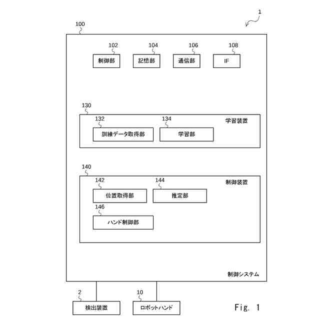 図1は、実施形態1にかかる把持システム1の構成を示すブロック図である。把持システム1は、検出装置2、ロボットハンド10、および制御システム100を有する。制御システム100は、検出装置2およびロボットハンド10と、無線または有線の通信ネットワークを介して接続されている。