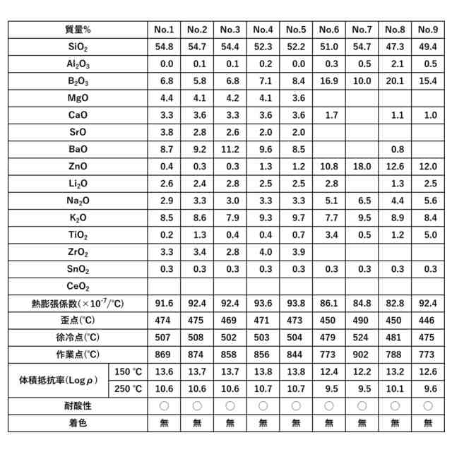などのガラスの骨格成分を減らしたり、アルカリ金属成分を増やしたりする組成変更を行うとガラスの耐酸性が劣化してしまう。耐酸性の不十分なガラスを酸処理やメッキ処理すると、ガラス表面が劣化して細かいクラックを生じる。ガラス表面にこのようなクラックが存在すると様々な汚れや水分が付着しやすく、素子の表面抵抗が下がって電気製品の不具合を生じることがある。