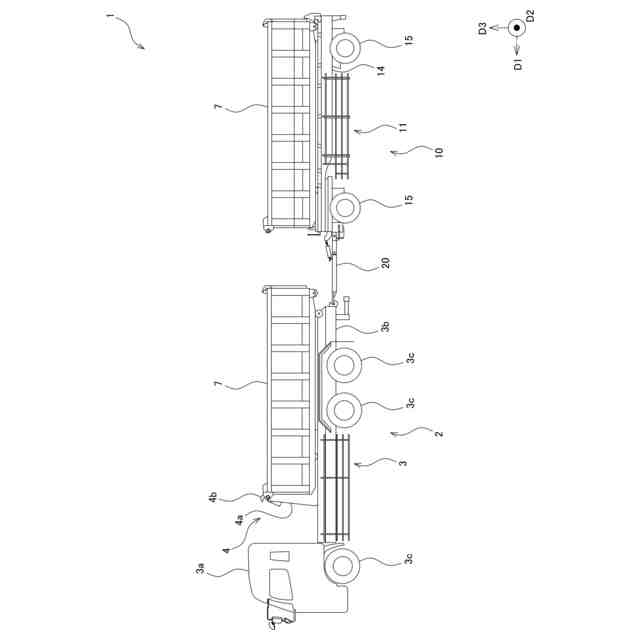 一実施形態に係る連結車両の側面図であって、車両走行状態を示す図