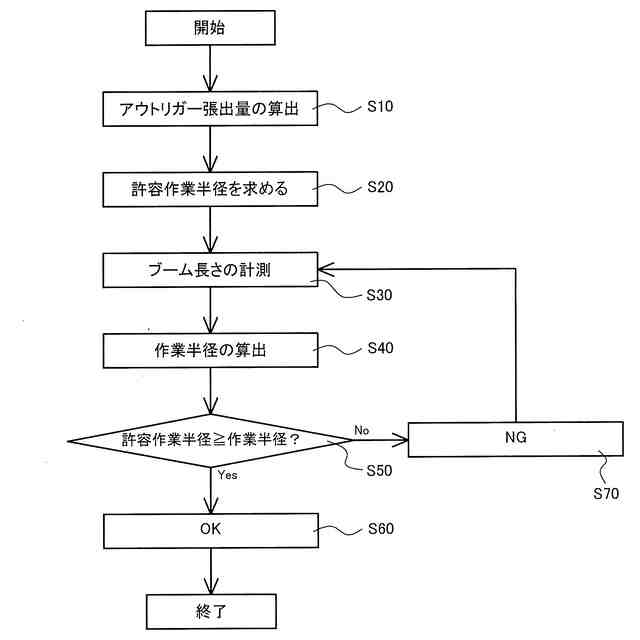 移動式クレーンのブーム作業範囲は、アウトリガーの張り出し量や、移動式クレーンを構成する車両特性(例えば重量)などにより、安全性を確保できる範囲が定められる。このため、従来は、予め求めた作業範囲に沿ってカラーコーン(登録商標)等を配置する措置が採られ、ブームがこの作業範囲を越えないようにクレーン操作を行うようにしていた。しかし実際には、ブームの先端位置と地面に配置されたカラーコーン(登録商標)との位置関係を正確に把握する事は難しく、ブームの先端が設定した作業範囲を越えた状態で作業を実施してしまうといった事態も生じていたという実状がある。