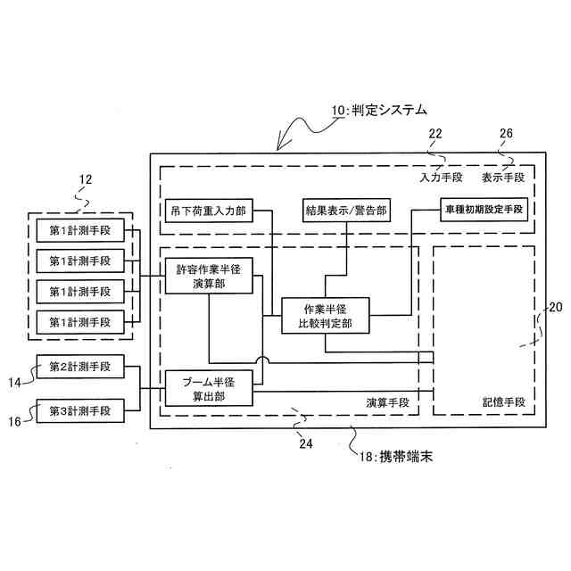 【解決手段】第1計測手段12と、第2計測手段14、及び第3計測手段16と、少なくとも、作業車両50の定格荷重線図が保存されている記憶手段20と、作業車両50の車種の選択、及び吊り下げ荷重の入力を行う入力手段22と、第2計測手段14と第3計測手段16によって計測された計測値に基づいて伸縮ブーム54による作業半径を算出し、入力手段を介して入力された吊り下げ荷重と第1計測手段を介して計測されたアウトリガーの張出量とを前記定格荷重線図に当てはめて得られる許容作業半径と、作業半径とを比較し、作業半径が許容作業半径以下であるかを判定する演算手段と、を有する携帯端末18と、を備えることを特徴とする。