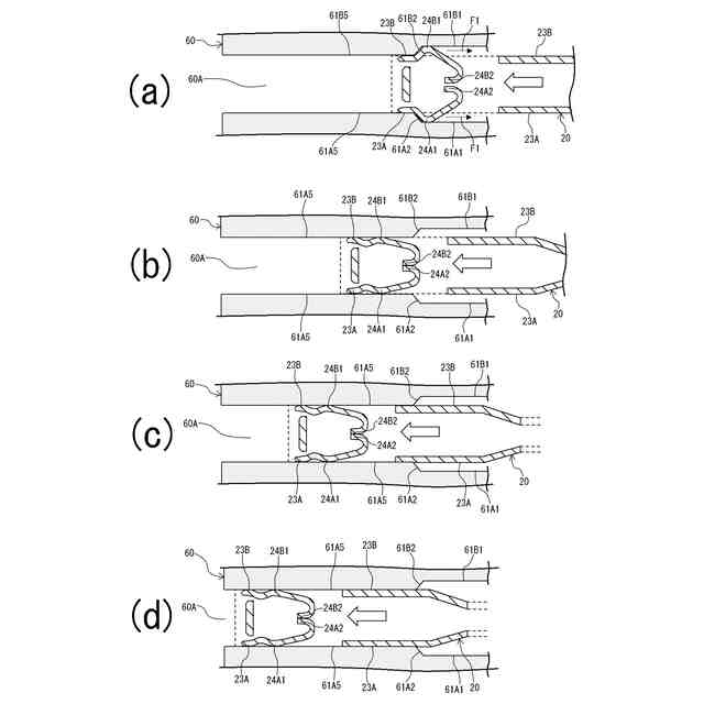 前記一方の側の収容部内側面、前記他方の側の収容部内側面は、前記第1の方向において、前記一方の側の収容部内側面と前記他方の側の収容部内側面の間の間隔が前記第1の方向に沿って略一定とされた第1領域と、前記第1領域の前記第1の方向における前記他方の側に設けられ前記間隔が前記第1の方向における前記他方の側に向けて徐々に狭くなる第2領域と、前記第2領域の前記第1の方向における前記他方の側に設けられ前記間隔が前記第1の方向に沿って略一定とされた第3領域と、が設けられるように構成され、