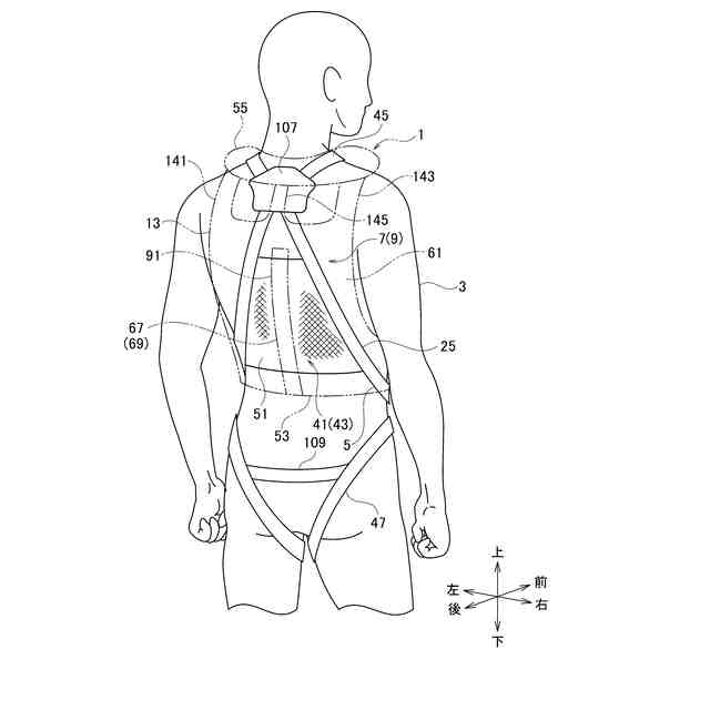 従来、高所作業において、作業者の墜落を阻止する物としてフルハーネスや胴ベルトがある。これらは墜落を確実に阻止して、作業者を死亡を含む重大災害から守ることが出来る。なお、エアーバッグとして、乗り物に乗車している乗員が着用し、作動時に膨張用ガスを流入させて膨張するものが知られている(特許文献1参照)。