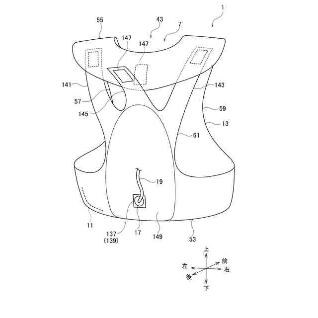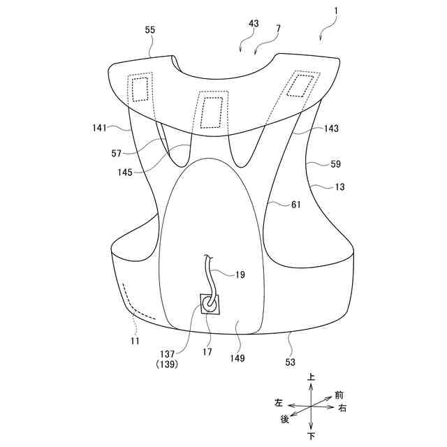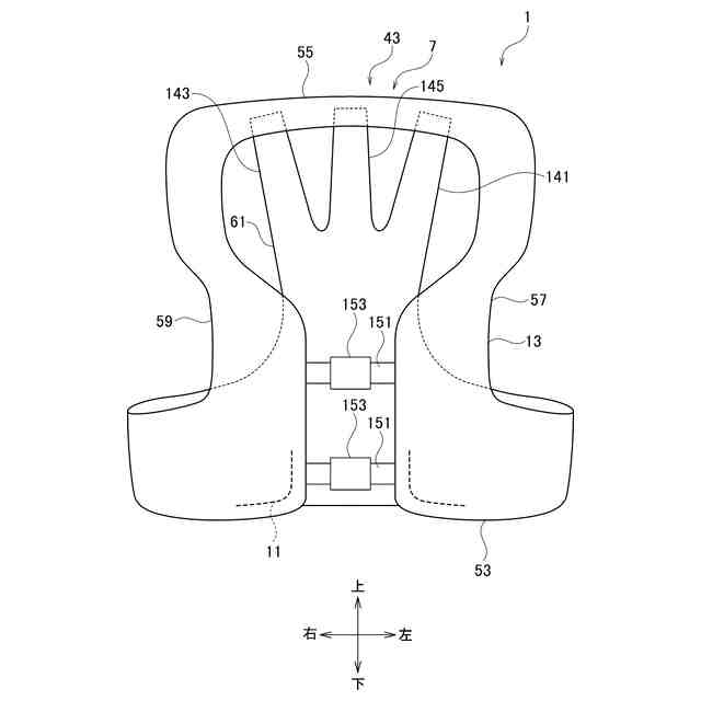 左側の端部が前記一対の肩ベルトのうちの左後側に位置している肩ベルトに接続されており右側の端部が前記一対の肩ベルトのうちの右後側に位置している肩ベルトに接続されている背当て部と、