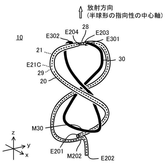 同軸ケーブルと線状導体は、ギャップ部を基準として、90°の間隔で配置され、かつ、それぞれ、180°に捻れた形状である。同軸ケーブルの内導体は、外導体第1端部の位置から先端部側の部分に切断部を有する。nを正の整数とし、放射する電波の同軸ケーブル1波長の電気長をλとして、外導体第1端部から切断部までの内導体の長さは、(2n-1)λ/4である。